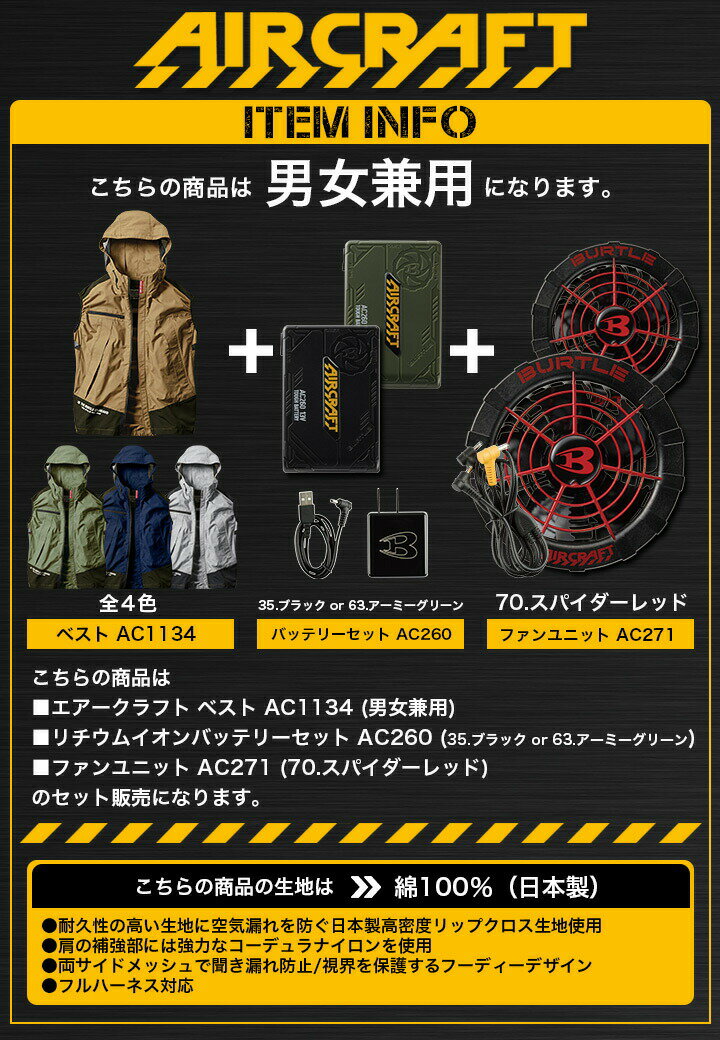 ・生地からの空気漏れを防ぐ日本製高密度リップクロス素材を採用 ・高強度コーデュラナイロン素材を採用 ・着用時に通気調整可能な背裏エアダクトを装備 ・脇下を冷却する脇通気メッシュ仕様 ・フルハーネスランヤード取付口付き ・ヘルメット対応大型フード付き ・男女ユニセックスシリーズ 【素材】高密度リップクロス、補強布コーデュラ 【混率】本体:綿100%、別布:綿70%・コーデュラナイロン30% 【セット内容】 ■バートル エアークラフト ファンユニット AC271 2021年モデル パワーアップしたバッテリーに対応するバリエーション豊富な高性能ファンユニット。