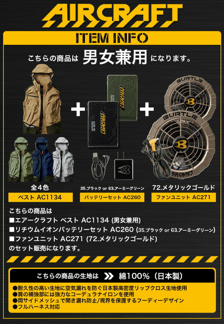 ・生地からの空気漏れを防ぐ日本製高密度リップクロス素材を採用 ・高強度コーデュラナイロン素材を採用 ・着用時に通気調整可能な背裏エアダクトを装備 ・脇下を冷却する脇通気メッシュ仕様 ・フルハーネスランヤード取付口付き ・ヘルメット対応大型フード付き ・男女ユニセックスシリーズ 【素材】高密度リップクロス、補強布コーデュラ 【混率】本体:綿100%、別布:綿70%・コーデュラナイロン30% 【セット内容】 ■バートル エアークラフト ファンユニット AC271 2021年モデル パワーアップしたバッテリーに対応するバリエーション豊富な高性能ファンユニット。