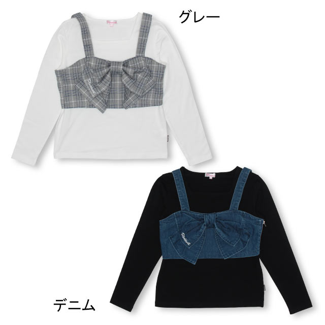 綿100% Tシャツとビスチェの2点セット ・ビスチェ デニム、ツイル、格子 サイドファスナー開き/背中シャーリングゴム/肩紐ボタン調節可能/ロゴ刺繍 ・ロンT 天竺/スクエアカットネック/袖口ロゴ刺繍 ※写真のプリント位置と多少の誤差が生じる場合があります。
