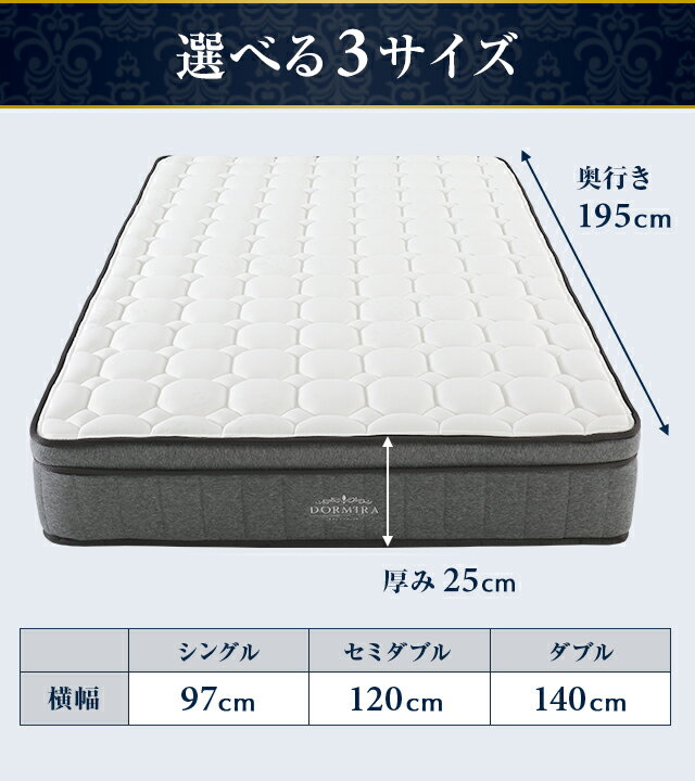 送料無料(北海道札幌市のみ800円・札幌市以外1600円、東北400円、沖縄・離島見積り) カラー ホワイト サイズ シングル…幅97㎝×奥行き195㎝×厚さ25㎝ セミダブル…幅120㎝×奥行き195㎝×厚さ25㎝ ダブル…幅140㎝×奥行き195㎝×厚さ25㎝ 材質 外装生地…ポリエステル100% 本体…ポケットコイルスプリング コイル数…シングル608個、セミダブル768個、ダブル896個 詰め物…ウレタンフォーム、フェルト、樹脂綿 保証 10年間保証 送料について 無料 北海道札幌市のみ800円・札幌市以外1600円、東北400円、沖縄・離島見積り 配送について 商品の配送は全て宅配便(1人)での玄関渡しとなります。